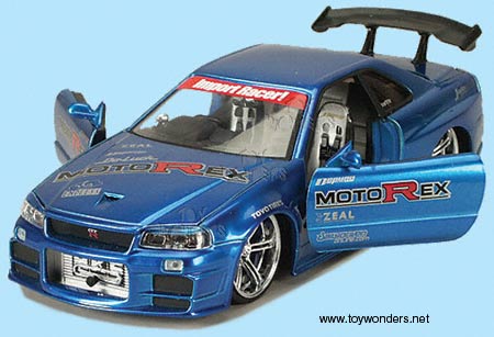 50945Z Import Racer! Nissan Skyline. 1:24 scale diecast model. This Nissan is an 8" long diecast street racer style car with opening doors/trunk/hood and DG Luck rims. This Nissan tuner/sports car is manufactured by Jada Toys. 4 pcs per display box and in assorted colors. 16 pcs per inner box.