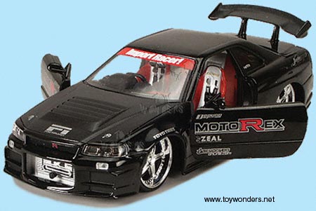 50945CR Import Racer! Nissan Skyline. 1:24 scale diecast model. This Nissan is an 8" long diecast street racer style car with opening doors/trunk/hood and GFG rims. This Nissan tuner/sports car is manufactured by Jada Toys. 4 pcs per display box and in assorted colors. 16 pcs per inner box.