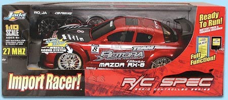 83285 Import Racer - Mazda RX8. 1:10 scale. Radio control with full function, battery pack and charger included. Beautiful finishing with extra set of changeable tires. You can race all night with neon series included. Jada Toys. Two colors. 27MHZ blue light.