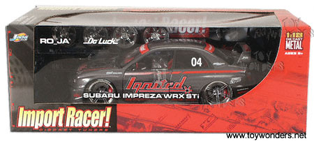 63294GY JADA Import Racer! Subaru WRX. 1:18 scale diecast model car. This Subaru is a 10"Lx4"Wx3"H diecast race car with opening doors/trunk/hood and two sets of changeable rims and hood. Include screwdriver for swapping parts. This Subaru tuner/sports car is manufactured by Jada Toys. 3 pcs per inner box. 63294 in Gray color. Individually packed in a window box.