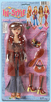 4883/4 In-Style Fashion Show. 12" doll with fashionable outfit, also include 2 pair of boots, purse and comb. Blister card size: 7.5"x16".