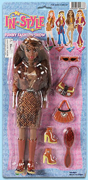 4885/6B In Style Fashion Show (Black). 12" fashion doll with rooted hair. Set include clothing, 2 pair of boots and purse, and a comb. Card size: 7.5"x16".