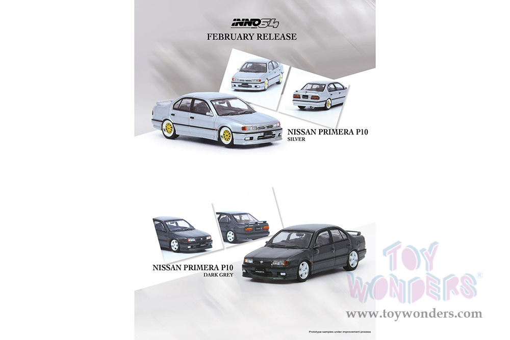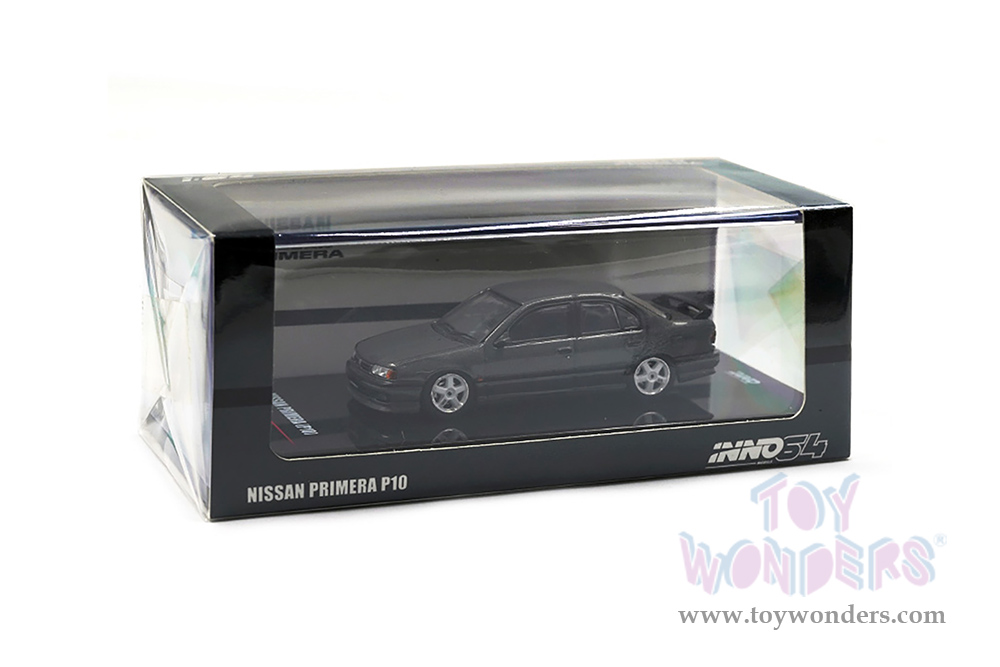 IN64P10-GMG Inno Models - Nissan Primera P10. 1:64 scale diecast collectible model car. This Nissan is a 2.75"L x 1"W x 0.75"H diecast collection car. This Nissan Primera is manufactured by Innovative Service & Trading Co., Ltd. IN64P10-GMG is in Gun Metal Grey. Individually packed in a hard-acrylic plastic case. Case size: 4.75"Lx 2.25"Wx 2"H. Adult collection. Not for children under 14 years old.