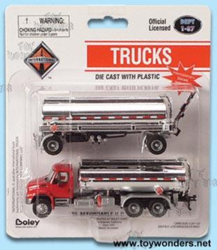 4129/16 BOLEY Double International 4300 3-Axle double Tanker with Trailer. 1:87 scale or HO scale diecast metal tanker trucks . 2 parts: 4"long trailer with tanker & a 3.5"long tanker. Diecast with plastic. Detail finishing. Boley. card size: 5.25"x6". RED with silver color.