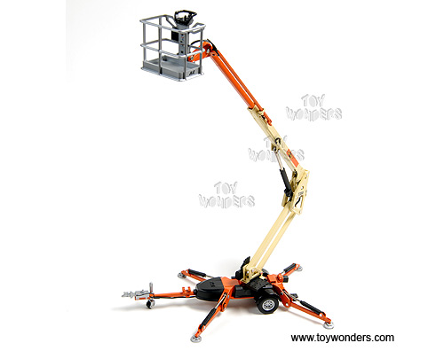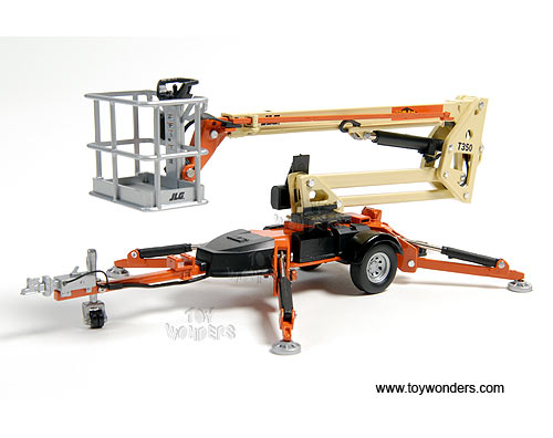 T350 JLG Series 2 - Trailer Mounted Boom Lift. 1:32 scale diecast collectible model. This Trailer Mounted Boom Lift is 6" long. Manufactured by JLG Industries, Inc. Individually packed in a window box. Box size: 10"L x 4"W x 4.75"H. T350 is in ORANGE & YELLOW 2-tone colors.