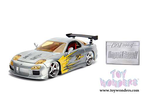 31088 Jada Toys - 20th Anniversary | Import Racer! 1983 Mazda RX-7 Hardtop. 1:24 scale diecast collectible model car. This Mazda is an 8.5"L x 4"W x 2.25"H diecast metal cars with openable doors, hood and trunk. Freewheeling and includes a two-sided diecast mosaic tile detailing the history of the brand. This car is manufactured by Jada Toys. It comes individually packed in a window box. Window Box is 10"L x 4.75"W x 4.75"H. Item 31088 is in Raw Metal.