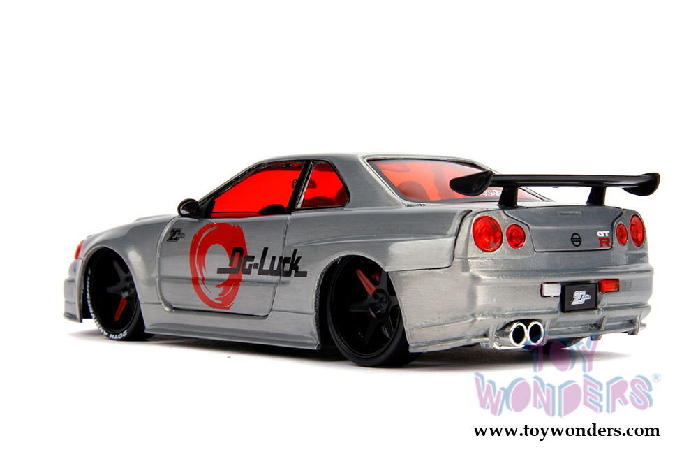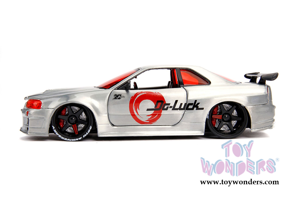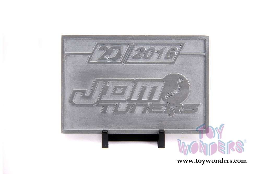31085 Jada Toys - 20th Anniversary | JDM Tuners 2002 Nissan Skyline GT-R Hardtop. 1:24 scale diecast collectible model car. This Nissan Skyline is an 8"L x 3.5"W x 2.25"H diecast metal cars with openable doors, hood and trunk. Freewheeling and includes a two-sided diecast mosaic tile detailing the history of the brand. This car is manufactured by Jada Toys. It comes individually packed in a window box. Window Box is 12"L x 6"W x 4.5"H. Item 31085 is in Raw Metal.