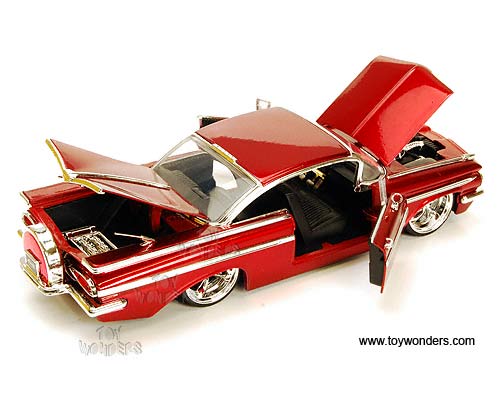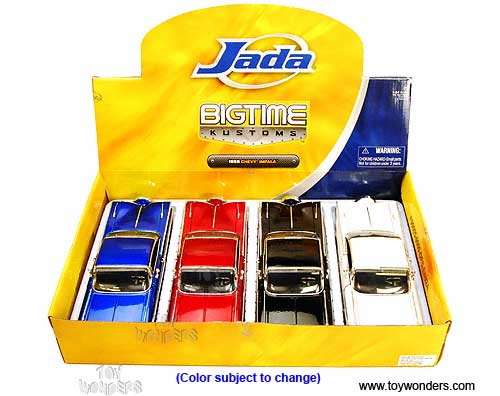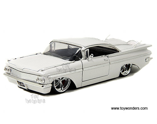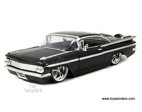 90632A Jada Toys Bigtime Kustoms - 1959 Chevy Impala Hard Top. 1:24 scale diecast collectible model car. This 1959 Chevorlet Impala is a 9.25"L x 3.25"W x 2.25"H with openable hood, doors & trunk, KMC SS 5-spoke rims. This 1959 Chevrolet Impala is a diecast metal and street lowrider. Manufactured by Jada Toys. Big Time Muscle. 4 pcs per display box in assorted colors. GM is a trademark of the General Motors Corporation.