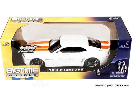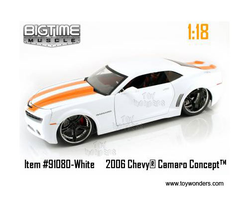 91080W BIGTIME Muscle - 2006 Chevy Camaro Concept Hard Top. 1:18 scale diecast collectible model car. This Chevrolet is 11"L x 4.75"W x 2.25"H die cast metal car with openable hood, doors & trunk. Custom engine and interior! This Chevy Camaro is manufactured by Jada Toys. Big Time Muscle. 91080 in WHITE color with Orange stripes on hood & trunk. Individually packed in a window box. Box size: 14.25"Lx6.75"Wx 5.25"H. 3 pcs per inner box.