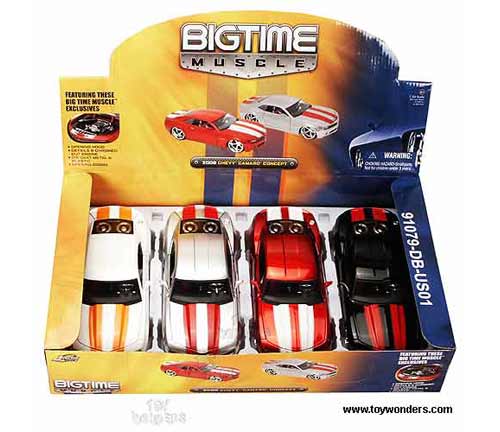 91079IN Jada Toys Bigtime Muscle - 2006 Chevy Camaro Concept Hard Top. 1:24 scale diecast collectible model car. This Chevrolet Camaro is an 8.25"Lx 3.25"Wx 2.25"H die cast metal car with openable doors, hood & trunk. Details & chromed-out engine. Rims: HRE 411R. This 2006 Chevy Camaro is manufactured by Jada Toys. Big Time Muscle. 4 pcs per display box in assorted colors with stripes on top. 16 pcs per inner box. GM is a trademark of the General Motors Corporation.