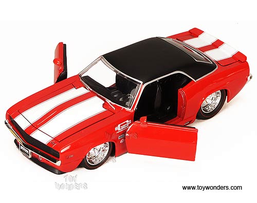 90210SM Jada Toys Bigtime Muscle - 1969 Chevy Camaro Hard Top. 1:24 scale diecast collectible model car. This Chevrolet Camaro is an 8.25"Lx 3"Wx 2.25"H die cast metal car with openable doors, hood and trunk. Details & Chromed-out engine. Rims: Mini Lite. The Chevy Camaro is manufactured by Jada Toys. Big Time Muscle. 4 pcs per display box in assorted colors with black roof. 16 pcs per inner box. GM is a trademark of the General Motors Corporation.