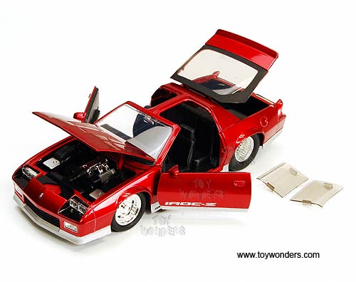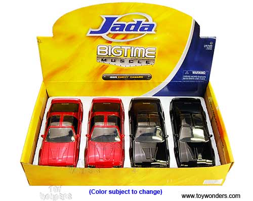 91444MP Jada Toys Bigtime Muscle - 1985 Chevy Camaro with Removable T-Top. 1:24 scale diecast collectible model car. This Chevrolet Camaro is an 8.25"Lx 3.25"Wx 2.25"H die cast metal car with openable doors, hood and trunk. Details & Chromed-out engine. Convo Pro rims. The Chevy Camaro is manufactured by Jada Toys. 4 pcs per display box in assorted colors. 16 pcs per inner box. GM is a trademark of the General Motors Corporation.