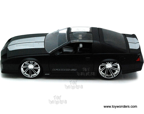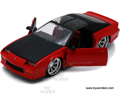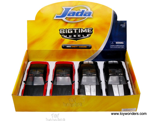 91444XW Jada Toys Bigtime Muscle - 1985 Chevy Camaro with Removable T-Top. 1:24 scale diecast collectible model car. This Chevrolet Camaro is an 8.25"L x 3.25"W x 2.25"H diecast metal car with openable doors, hood, and trunk. Detailed chromed-out engine. Rims: Saber 8. The Chevy Camaro is manufactured by Jada Toys. 4 pcs per display box in assorted colors. 16 pcs per inner box. GM is a trademark of the General Motors Corporation.