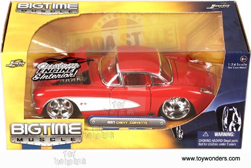 90935CK Bigtime Muscle - 1957 Chevy Corvette Hard Top. 1:24 scale diecast model car. This 57 Chevrolet Corvette is 8" long x 3"W x 2.25"H with opening doors, hood & trunk. This 1957 Chevy Corvett comes with Paradox rims, custom engine & interior. This 1957 Chevy Corvette is manufactured by Jada Toys. 90935CK in assorted colors. Individually packed in a window box WB. Box size: 10"Lx 4.75"Wx 4.75"H.