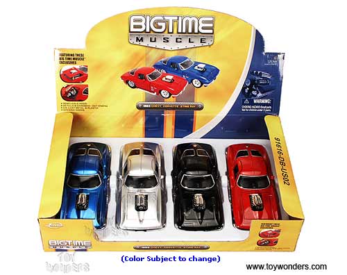 91616PD Jada Toys Bigtime Muscle - 1963 Chevy Corvette Stingray Hard Top with Engine Blower. 1:24 Scale diecast collectible model car. This Chevrolet Corvette Sting Ray is a 7.75"Lx 3.25"Wx 2.25"H die cast metal car with openable doors & trunk, and removable hood. Rims: Prostar. This 1963 Chevy Corvette Stingray is manufactured by Jada Toys. 4 pcs per display box in assorted colors and 16 pcs per inner box. GM is a trademark of the General Motors Corporation.