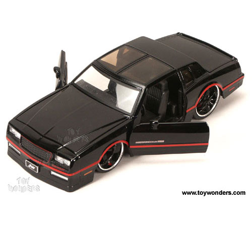 91361JY Jada Toys Bigtime Muscle - 1986 Chevy Monte Carlo T-Top. 1:24 scale diecast collectible model car. This Chevrolet is an 8"Lx 3.25"Wx 2.25"H die cast metal car with openable doors, hood & trunk. Details & chromed-out engine. Rims: Cartelli Grazia. This Chevy Monte Carlo is manufactured by Jada Toys. 4 pcs per display box in assorted colors. 16 pcs per inner box. GM is a trademark of the General Motors Corporation.