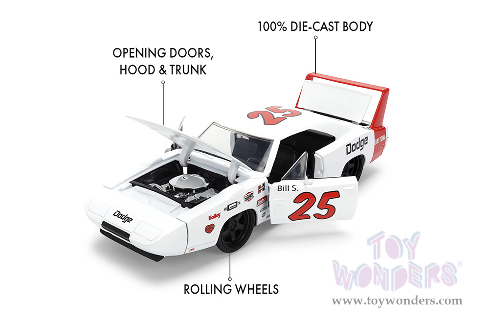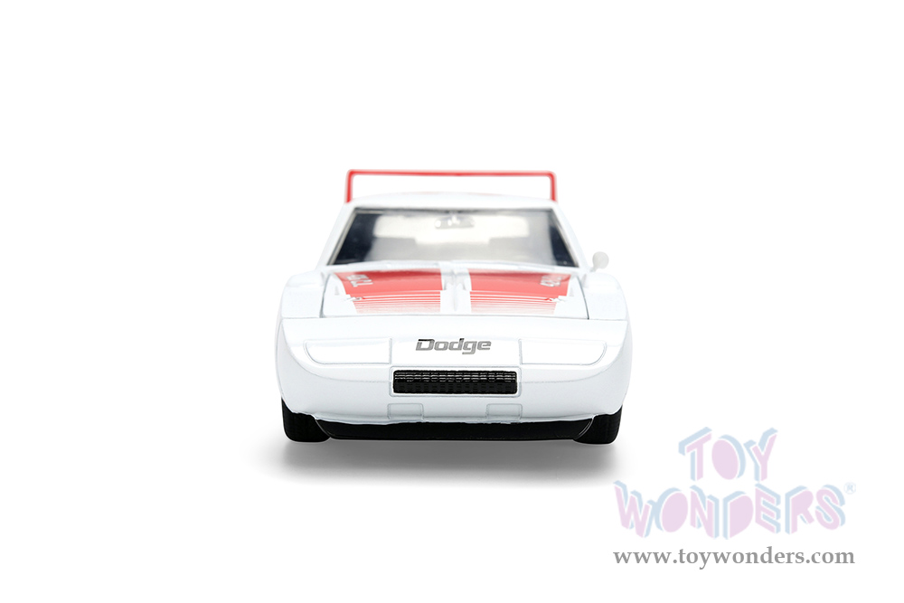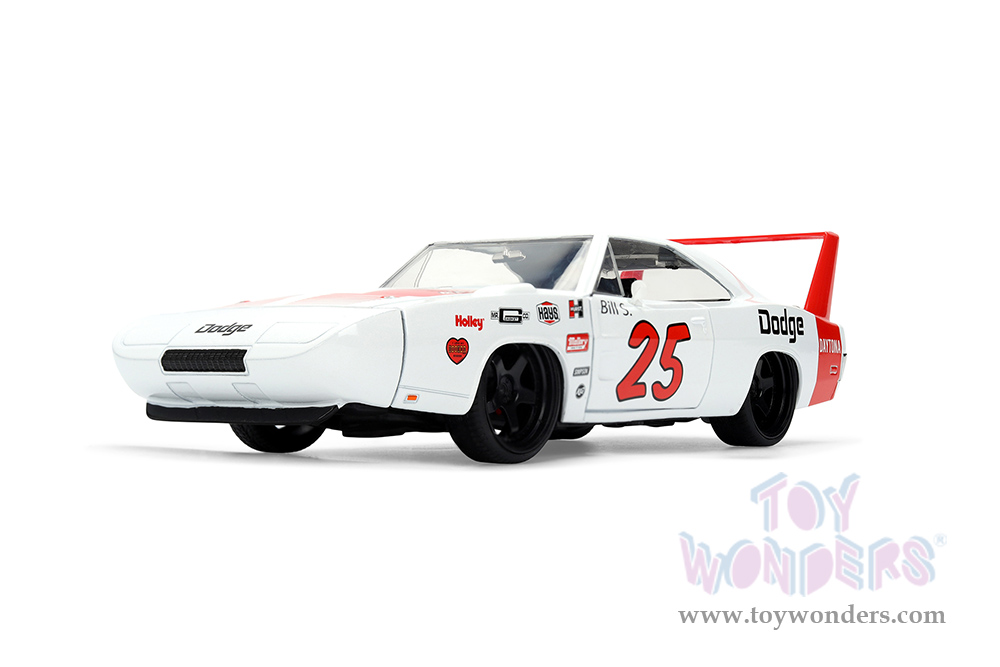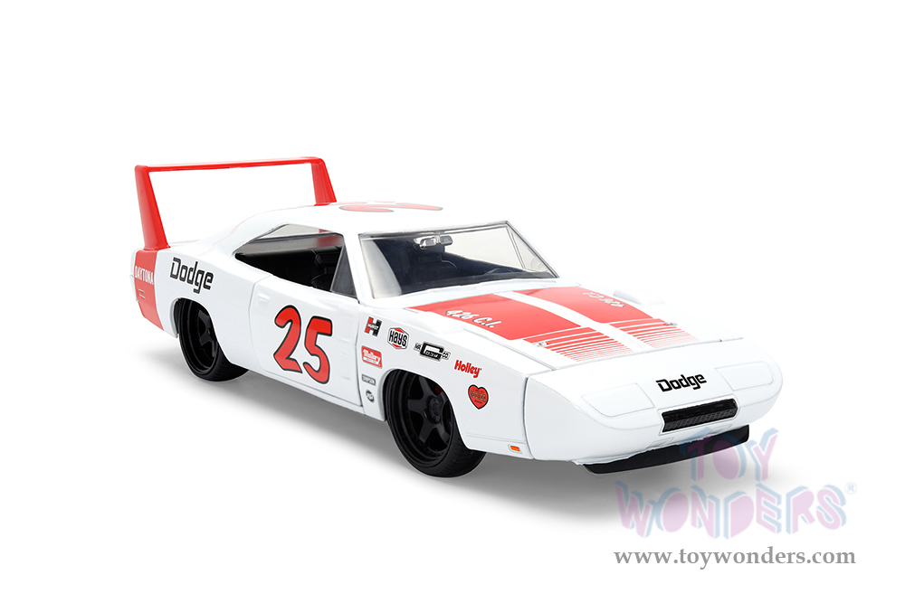 36608 Jada Toys Bigtime Muscle - 1969 Dodge Charger Daytona #25. 1:24 scale diecast collectible model car. This Dodge Charger is an 8"L x 3.75"W x 3.25"H diecast metal car with openable hood, doors and trunk. This Dodge is manufactured by Jada Toys. 36608 is in white with red stripes. Individually packed in a Window Box WB. Box size: 10"Lx 4.75"Wx 4.75"H.