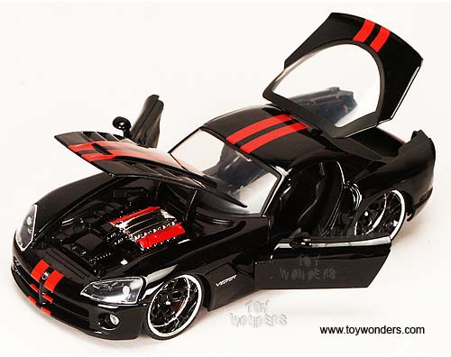 91804TQ Jada Toys Bigtime Muscle - 2008 Dodge Viper SRT10 Hard Top. 1:24 scale diecast collectible model car. This Dodge Viper SRT-10 is a 7.75"Lx 3.25"Wx 2"H die cast metal car with openable doors, hood and trunk. Details & Chromed-out engine. Rims: Viper BTM. This 2008 Dodge Viper SRT10 is manufactured by Jada Toys. Big Time Muscle. 4 pcs per display box in assorted colors with stripes on top. 16 pcs per inner box.