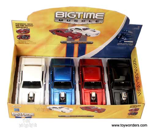 92015PD Jada Toys Bigtime Muscle - 1965 Ford Mustang with Engine Blower. 1:24 scale diecast collectible model car. This 1965 Ford Mustang is an 8"L x 3"Wx 2"H die cast metal with openable doors, hood & trunk. Prostar rims. This 65 Ford Mustang is manufactured by Jada Toys. 4 pcs per display box in assorted colors. 16 pcs per inner.