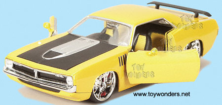 90216AC DUB City Bigtime Muscle Plymouth Cuda (1970) 1:24 scale. This 1970 Plymouth Cuda is a 7.75" long diecast with opening doors/hood/trunk, Veilside rims, and street low rider. This 70 Plymouth Cuda is manufactured by Jada Toys. 4 pcs per display box and in assorted colors. 16 pc. per inner box.