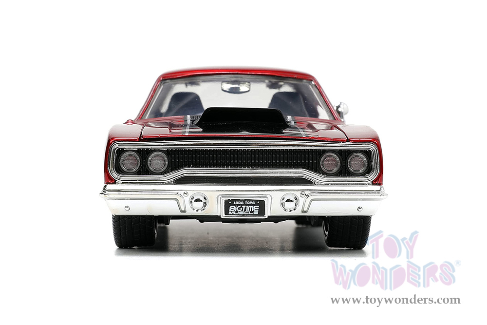 33866 Jada Toys Bigtime Muscles - 1970 Plymouth Road Runner Hardtop. 1:24 scale diecast collectible model car. This Plymouth Road Runner is an 8.5"L x 3.25"W x 2.5"H diecast metal car. Freewheeling with openable doors, hood and trunk. This Plymouth RoadRunner is manufactured by Jada Toys. Individually packed in a window box. Window Box size: 10"L x 4.75"W x 4.75"H. Item 33866 is in Candy Red with flames.