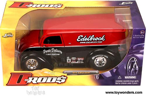 90974 D-RODZ - DIV Cruizer Edelbrock Parts Delivery Van. 1:24 scale diecast collectible model car. 8" long x 3.5"Wx 3"H die cast metal with opening side & rear doors. Details & chromed-out engine. Draglite rims. Custom reverse opening doors. Manufactured by Jada Toys. Also known as D-Rod D Rod D Rods D Rodz DRod DRodz DRods D-ROD$. Individually packed in a window box. Box size: 10"Lx 4.75"Wx 4.75"H. 90974 in BLACK color with Red top.