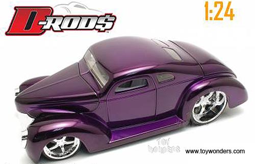 90836 D-RODZ 1940 Ford Hard Top. 1:24 scale diecast model car. 8" long die cast model with opening doors/hood/trunk. D-ROD$ Hobby Exclusive. Jada Toys. Window Box. Also known as D-Rod, D-Rods, D-Rodz, D Rod, D Rods, D Rodz, DRod, DRodz, DRods. 90836 in PURPLE and COPPER colors. WB