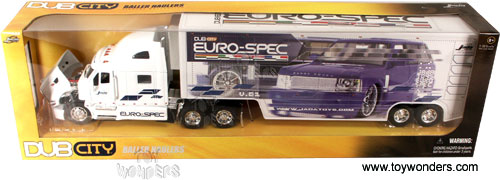 90662 DUB City Baller Haulers - Euro Spec Peterbilt 387 Tractor Trailer. 1:32 scale diecast collectible model car. 23" long x 3.25W x 6"H die cast metal with plastic trailer with openable hood, doors & tailgate. Individually packed in a window box. Box size: 25.5"Lx 4.75"Wx 7.5"H. Manufactured by Jada Toys. Dubcity. 6 pcs per inner box. WHITE color.