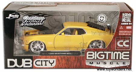 90348B Dubcity Bigtime Muscle - 1970 Ford Mustang Boss Hard Top. 1:24 scale diecast collectible model car. This 1970 Ford Mustang is an 8.5" long diecast metal with openable doors, hood & trunk. Street lowrider. Dub City Big Time Muscle. This 70 Ford Mustang is manufactured by Jada Toys. 6 pcs per inner box. Individually packed in a window box WB. 90348 in assorted colors.