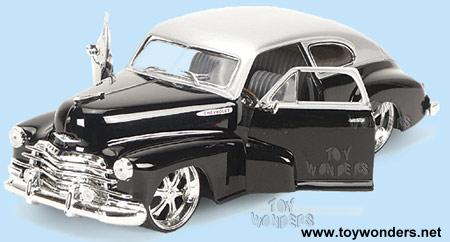 50217K JADA DUB City - 1947 Chevy Aerosedan Fleetline. 1:24 scale diecast model car. This 1947 Chevy Fleetline is 8.25" long x 3"W x 2.5"H, free wheel, diecast metal old skool classic Chevrolet Fleetline with Oasis B1 rims. Opening doors/hood. Streetlow street low rider 1947 Chevy is manufactured by Jada Toys. 4 pcs per display box and in assorted colors. 16 pcs per inner box. GM is a trademark of the General Motors Corporation.