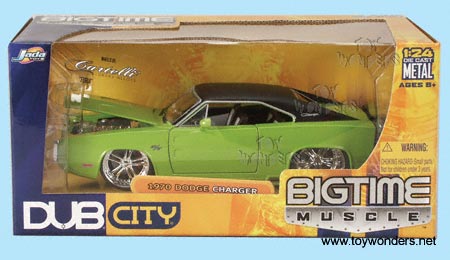 90021B DUB City-Dodge Charger (1970). 1:24 scale. This 1970 Dodge Charger is an 8.5" long diecast metal with opening doors/hood/trunk. This 70 Dodge Charger is street low rider. This 1970 Dodge Charger is manufactured by Jada Toys. BIGTIME muscle.