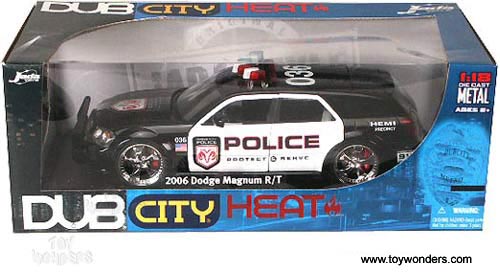 90571P DUB City Heat - 2006 Dodge Magnum R/T Police. 1:18 scale diecast model car. 11.5" long diecast police car with opening doors/hood/trunk. Dub City Jada Toys. Individually packed in a window box.
