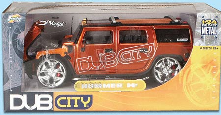 53549 DUB City Hummer H2. 1:24 scale diecast model car. This Hummer H 2 is an 8" long diecast metal with opening doors/hood/trunk. This Humvee sports utility vehicle also includes "Sound System" installation and street low rider. This Hummer SUV is manufactured by Jada Toys. Assorted colors. Individually packed in a window box WB.