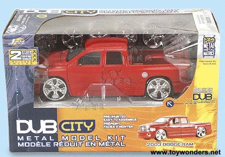 55767 Dub City- Metal Model Kit 2003 Dodge Ram Pick Up Truck Scale: 1:24 2003 Dodge Ram 8.5"L die cast metal pick-up truck model kit with pre-painted and easy to assemble parts and included screwdriver. Parts consist of chassis, interior, exterior, exterior, and 2 sets of wheels (Spintekand KMCrims). This 03 Dodge Ram pickup truck has opening doors/hood/tailgate, "Sound system", free wheeling, and street low rider. Manufactured by Jada Toys Individually packaged in window box 3 pcs per inner box