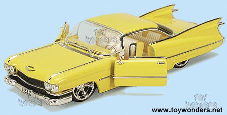 50667B Dub City OldSkool Cadillac Deville (1959)1:24 scale. This 1959 Deville is an 8.5" long diecast metal with hard top, Lorenzo 6-spoke rims, opening side and rear doors/hood, and "sound system". This 59 Devilled also has street low rider. This 1959 Caddy Deville is manufactured by Jada Toys. 4 pcs per display box and in assorted colors. 16 pcs per inner box.