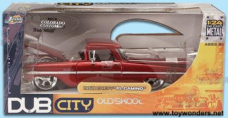 53357 DUB City-OldSkool 1959 Chevrolet El Camino pick up truck Scale: 1:24 1959 Chevy El Camino 8.5"L die cast metal pick-up truck with opening doors/trunk/hood, Colorado Custom rims, and low rider. Individually packaged in window box Manufactured by Jada Toys 6 pcs per inner box in assorted colors