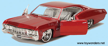 50317CK JADA DUB City - OldSkool 1967 Chevrolet Impala. 1:24 scale diecast model car. This 1967 Chevy Impala is an 8" long diecast classic with opening doors/hood, Paradox rims and street low rider. This 1967 Impala is manufactured by Jada Toys. 4 pcs per display box. 20 pcs per inner box. GM is a trademark of the General Motors Corporation.