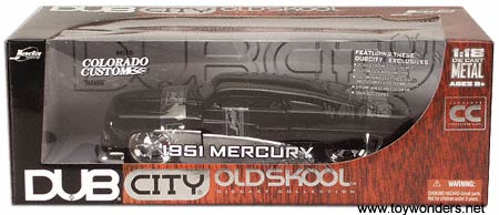 90049BK DUB City Oldskool - 1951 Mercury. 1:18 scale diecast model car. This 1951 Mercury is a 10.5" long diecast with opening doors/hood/trunk. Colorado Custom "Paradox" Wheels. This 51 Mercury is manufactured by Jada Toys. 3 pcs per inner box. 90049 in BLACK color. Individually packed in a window box.