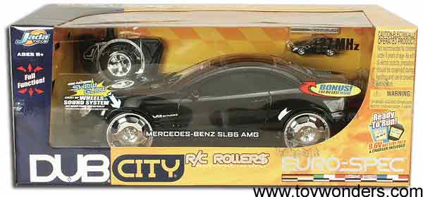 90186 DUB City R/C Mercedes Benz SL65 AMG. 1:10 scale, 16.5" radio controlled car, full function, show glow. Includes controller, antenna, rechargeable batteries, charger, bonus with a 1:64 scale car. Requires 1 "9V" batteries (included). 49 MHz. Jada Toys. 90186 in BLACK and SILVER colors. Note: This item contains no any diecast metal.