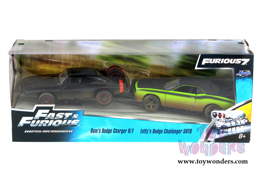 97340 Jada Toys Fast & Furious - Dom's 1970 Dodge Charger Off-Road and Letty's Dodge Challenger Off-Road Twin Pack Hardtop. 1:32 scale diecast collectible model car. These assortment cars are 5 1/2"L x 2"W x 1.5"H free wheeling, diecast classic muscle cars from the Fast & Furious movie. These cars are manufactured by Jada Toys. They come packed in a window box. Window box is 11.75"L x 3.5"W x 4.5"H. 6 pcs per inner in assorted colors and styles.