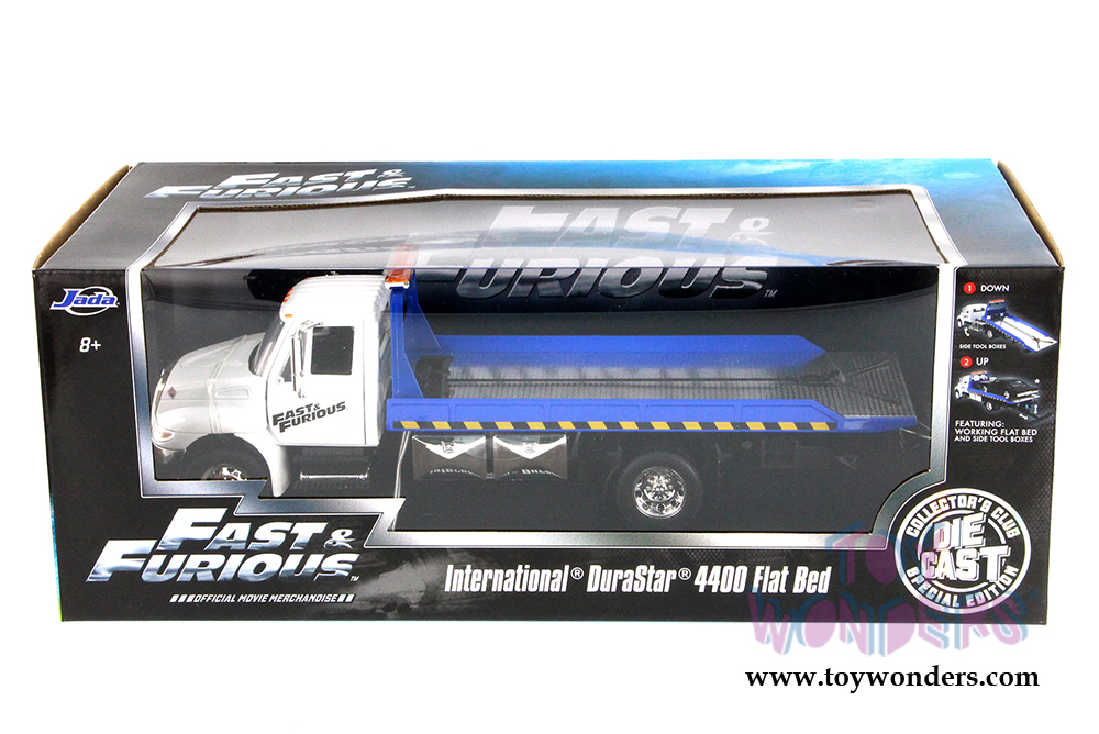 97218 Jada Toys Fast & Furious - International® Durastar 4400 Flat Bed Trailer. 1:24 scale diecast collectible model car. This Flat Bed is a 12.5"Lx 3.5"Wx 4"H die cast metal car. Free wheeling, opening doors, hood and tool boxes, tilting bed and movable wheel lift. This International® Durastar 4400 truck is manufactured by Jada Toys. Individually packed in a window box. Box size: 15.25"Lx 7.5"Wx 5.75"H. 97218 is in White with BLUE color. 3 pcs per inner box.