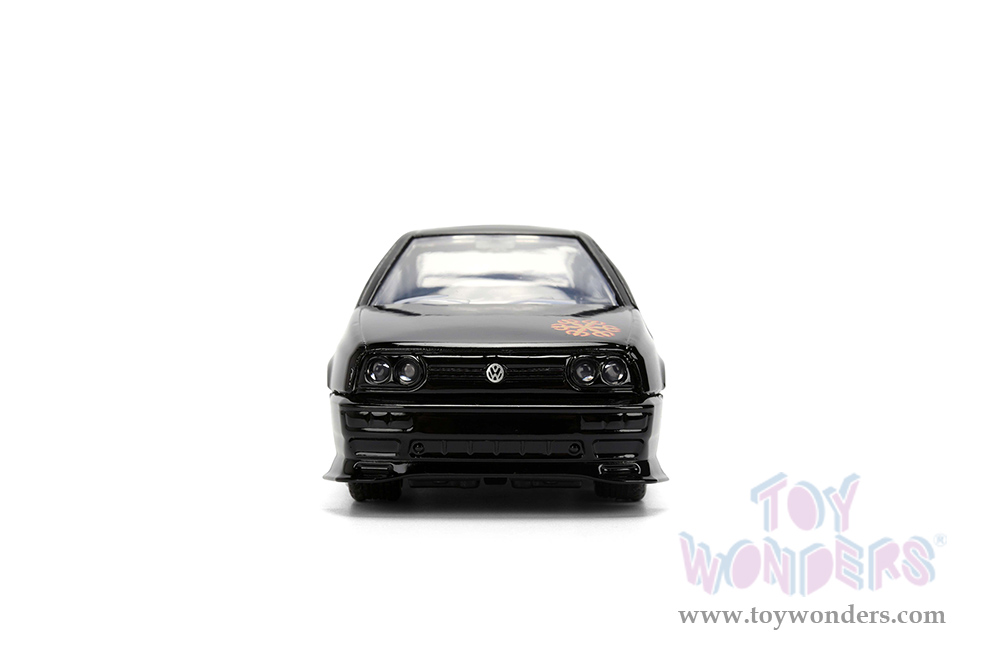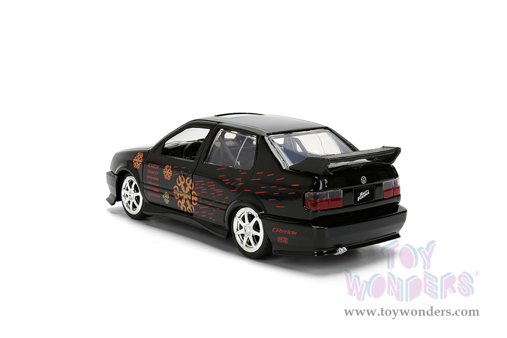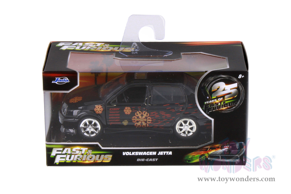 35628 Jada Toys Fast & Furious - 1995 Volkswagen Jetta "Fast & Furious Remix - 25th Anniversary" series. 1:32 scale diecast collectible model car. This VW Jetta is a 5"L x 1.75"W x 1.75"H diecast classic muscle car from the Fast & Furious series. Openable doors. This 1995 Volkswagen is manufactured by Jada Toys. It comes individually packed in a hang tab window box. Window box is 6"L x 3"W x 3"H. Item 35628 is in black with graphics.