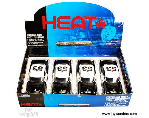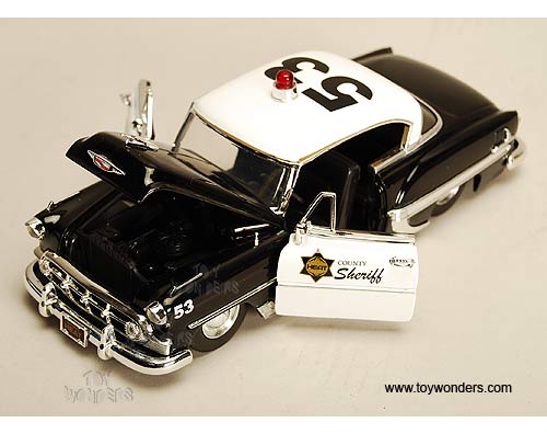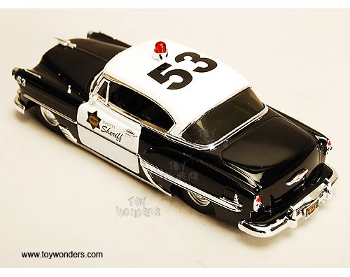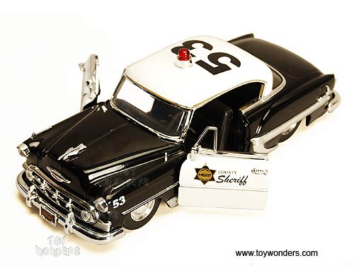 92453 Jada Toys Heat - 1953 Chevy Bel Air County Sheriff. 1:24 scale diecast collectible model car. This Chevrolet Belair is an 8.25"L x 3"W x 2.75"H die cast metal police car with openable hood & doors. Rims: Belair Stock Wheel. This Chevy Bel Air Police car is manufactured by Jada Toys. 4 pcs per display box in BLACK color with White doors & roof. 16 pcs per inner box. GM is a trademark of the General Motors Corporation.