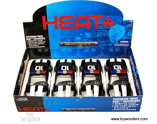 96090 Jada Toys Heat - 2010 Chevy Camaro SS Police Car. 1:24 scale diecast collectible model car. This Chevrolet Camaro Highway Patrol car is an 8.25"Lx 3.25"Wx 2.25"H die cast model car with openable hood, doors & trunk, details engine. The 2010 Chevy Camaro is manufactured by Jada Toys. 4 pcs per display box. 96090 is in BLACK color with White doors & White stripes on hood & trunk. GM is a trademark of the General Motors Corporation. 16 pcs/inner.
