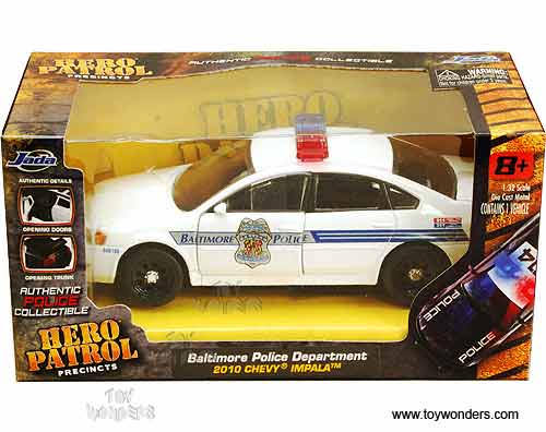 96341BLT Jada Toys Hero Patrol - 2010 Chevy Impala Baltimore Police Department. 1:32 scale diecast collectible model car. This Chevy Impala is a 5.25"Lx 2"Wx 1.75"H die cast metal police car with openable doors & trunk. 96341BLT is in WHITE color with Blue stripe. Individually packed in a window box. Box size: 6"L x 3W x 3"H. This Chevrolet Impala Police car is manufactured by Jada Toys. GM is a trademark of the General Motors Corporation.