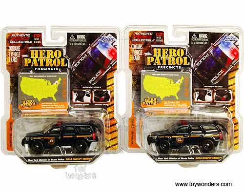 96339NY Jada Toys Hero Patrol - 2010 Chevy Tahoe New York Division of State Police. 1:64 scale diecast collectible model car. This 2010 Chevrolet Tahoe NYPD car is a 3.5" long die cast cars with openable doors & hatchback. Each car individually blister carded. Card size: 6" x 6.75". 96339NY is in DARK BLUE color. GM is a trademark of the General Motors Corporation.