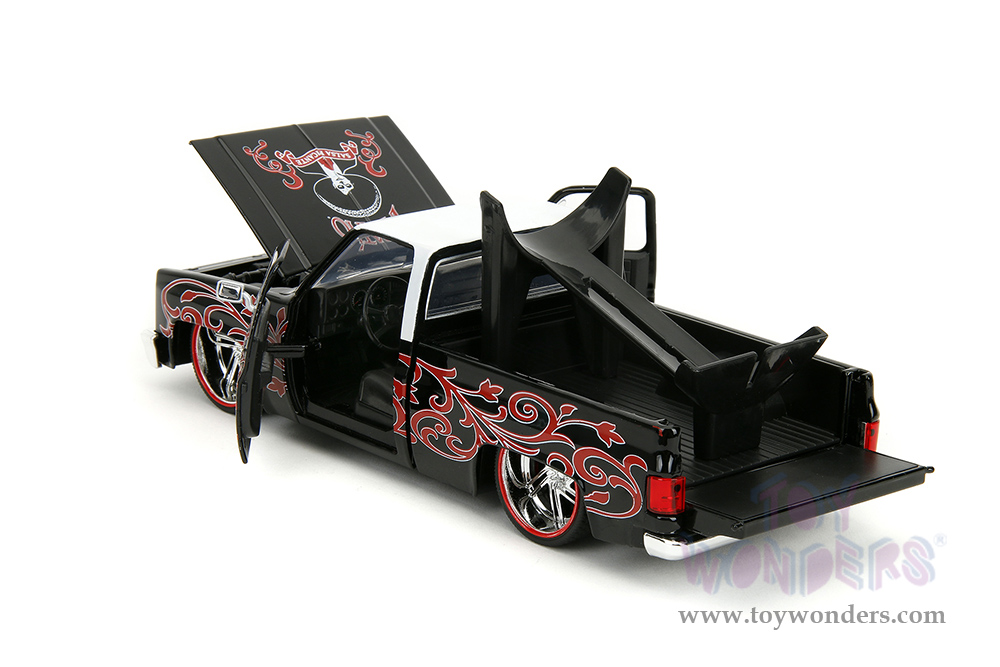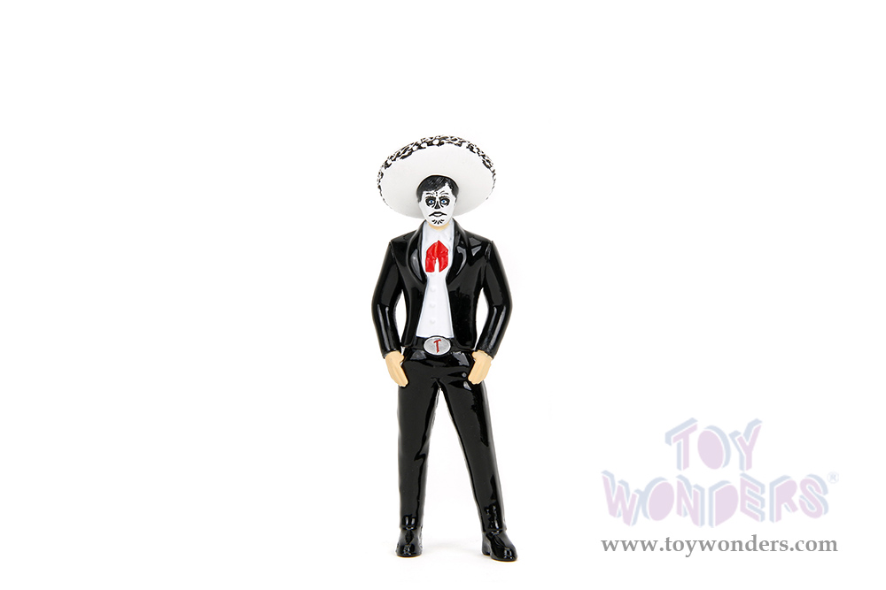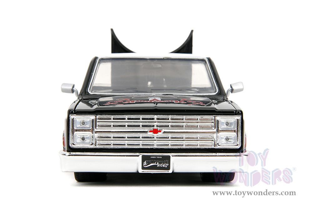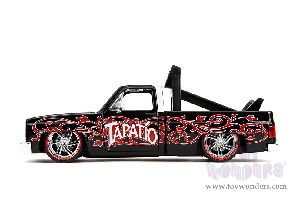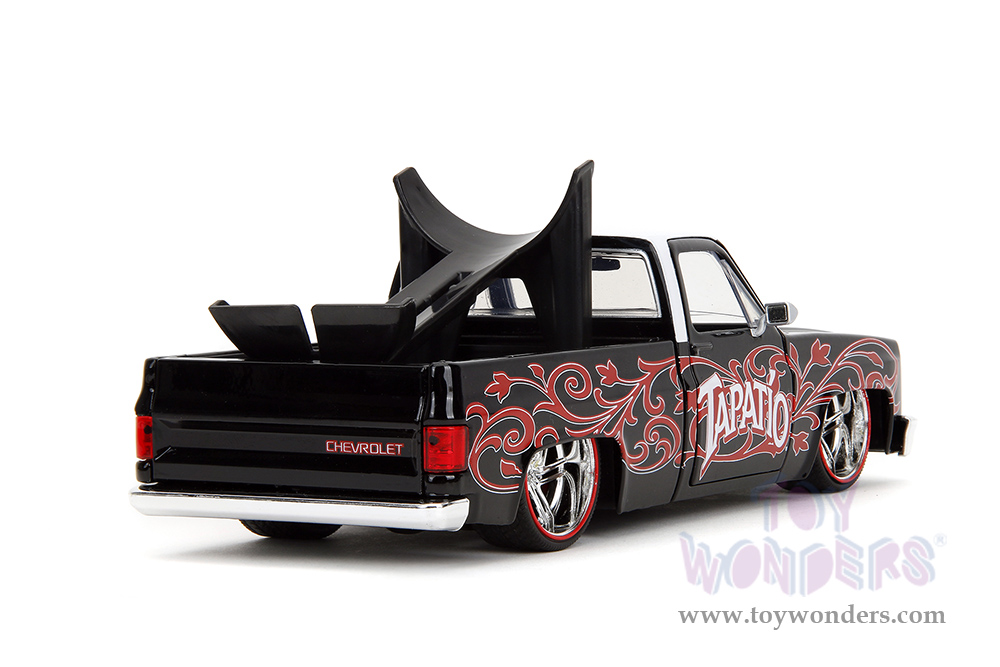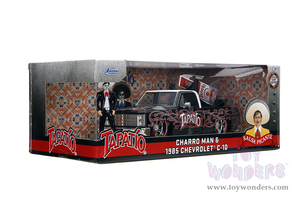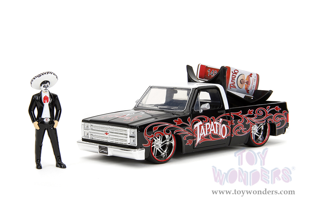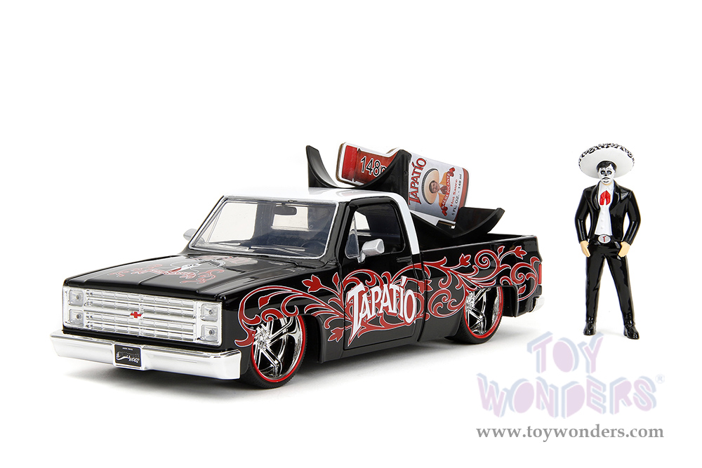 35476 Jada Toys - Hollywood Rides | 1985 Chevrolet® C10 Pickup Truck with Charro Man figure - Tapatio Day of The Dead. 1:24 scale diecast collectible model car. This Chevy® Truck is an 8.25"L x 3.75"W x 3"H diecast metal car. It includes a 3" non-articulating diecast Charro Figure. This Chevrolet® is manufactured by Jada Toys. Individually packed in a window box. Window Box is 12"L x 6"W x 4.5"H. Item 35476 is in black with red flowers graphics with white top.