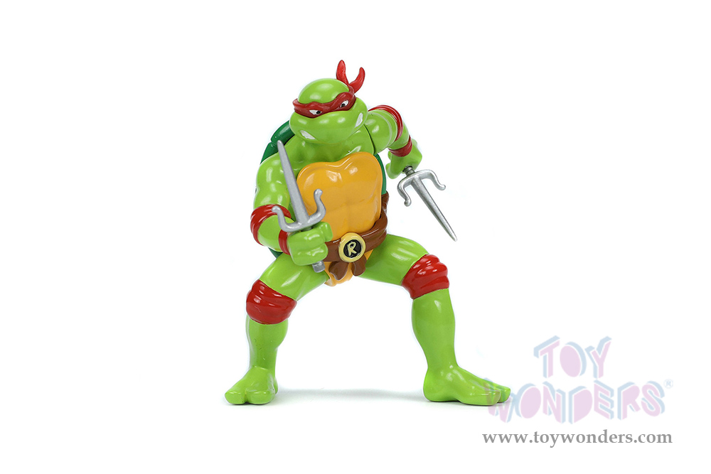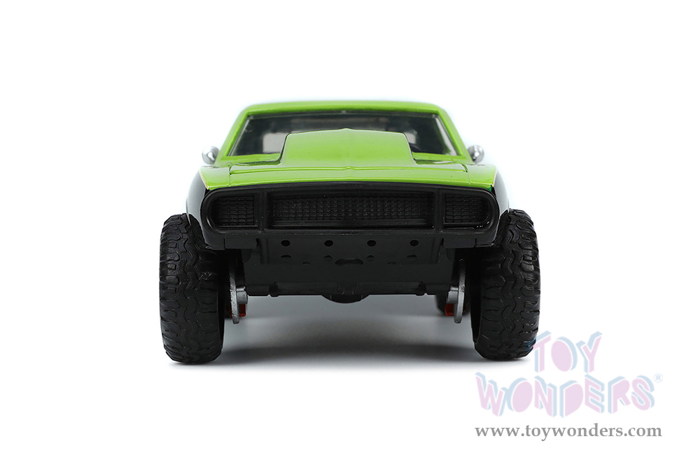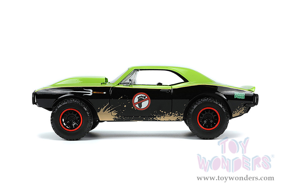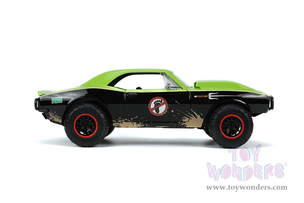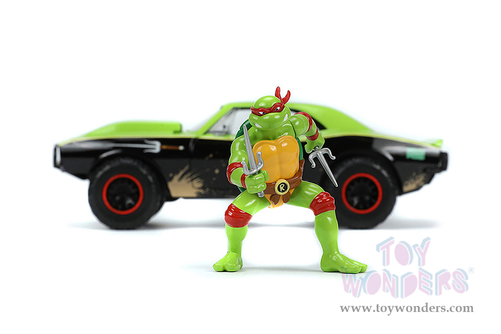 33386 Jada Toys - Hollywood Rides | 1967 Chevrolet® Camaro® (Dirty Version) with Raphael Diecast Figure "Teenage Mutant Ninja Turtles". 1:24 scale die-cast collectible model car. This Chevy® is an 8"L x 3.25"W x 2.75"H die cast metal car with opening hood, trunk and doors. Freewheeling. Detailed interior, exterior and engine compartment. Raphael figurine is approximately 2.5 inches tall. This Chevy® Camaro® is manufactured by Jada Toys. Individually packed in a window box (WB). Window box is 12"L x 6"W x 4.5"H. Item 33386 is in Bright Green and Matte Black.