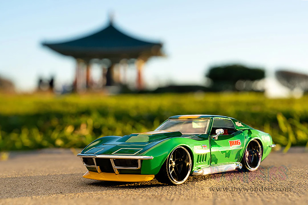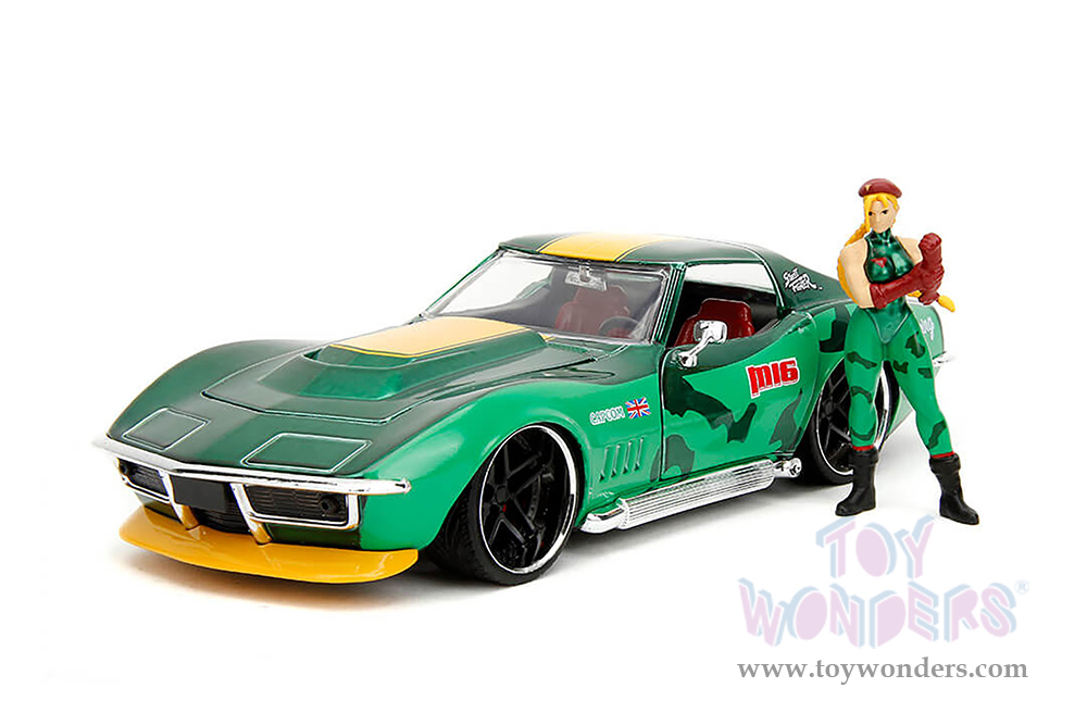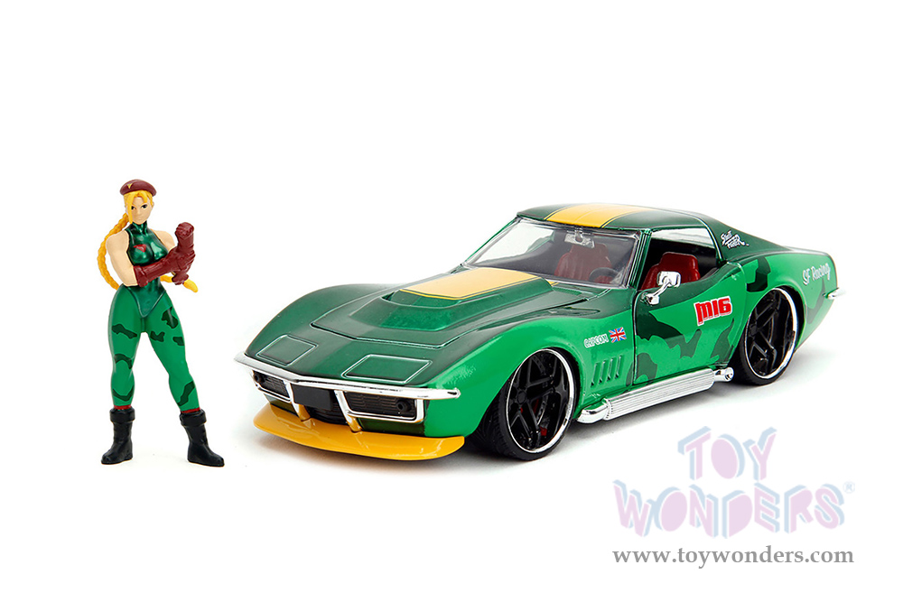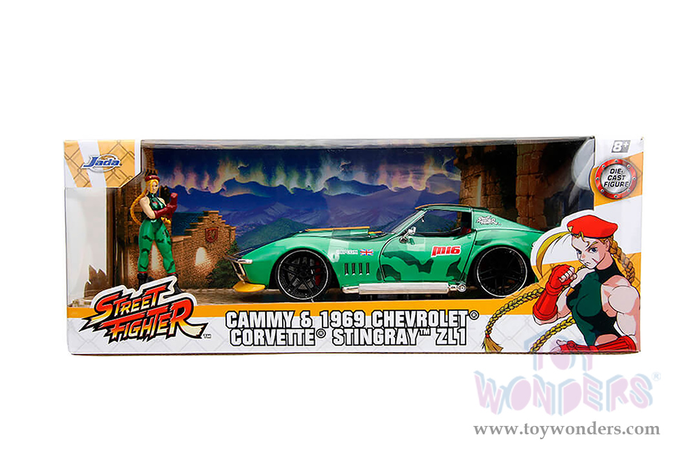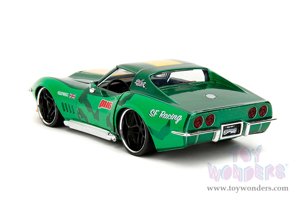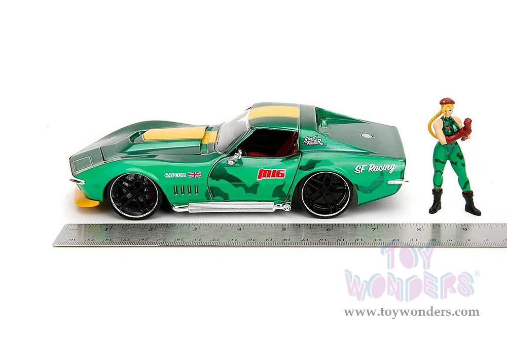 30837 Jada Toys - Hollywood Rides | 1969 Chevrolet® Corvette™ with Cammy Diecast Figure "Street Fighter". 1:24 scale die-cast collectible model car. This Chevy® is an 8"L x 3.5"W x 2.75"H die cast metal car with opening hood and doors. Freewheeling. Detailed interior, exterior and engine compartment. Cammy figurine is approximately 2.75 inches tall. This Corvette™ is manufactured by Jada Toys. Individually packed in a window box (WB). Window box is 12"L x 6"W x 4.5"H. Item 30837 is in green with yellow stripe.