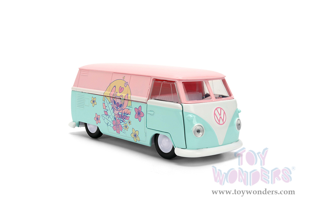 36358 Jada Toys - Hollywood Rides | 1961 Disney Stitch Volkswagen Bus. 1:32 scale diecast collectible model car. This Volkswagen is a 5"L x 1.75"W x 2"H diecast classic car. Openable doors. This Volkswagen Bus is manufactured by Jada Toys. It comes individually packed in a hang tab window box. Window box is 6"L x 3"W x 4.5"H. Item 36358 is in pastel pink and blue colors.
